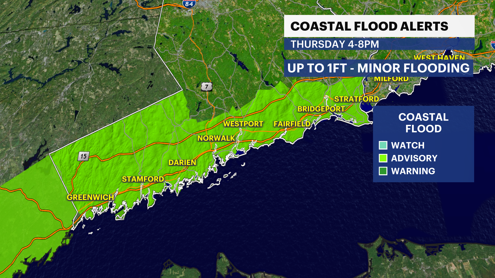 COASTAL FLOOD ADVISORY: Thursday 4 p.m.-8 p.m. for minor flooding during the evening high tide cycle. Inundation of up to 1 ft of water above ground level. Most vulnerable areas along the waterfront will be impacted.