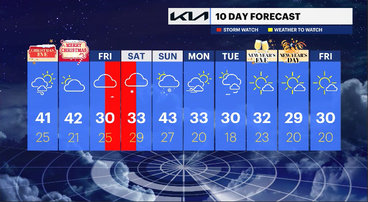 THURSDAY CHRISTMAS DAY: Mostly cloudy, less wind, seasonable temperatures. There is a slight chance for a rain or snow shower in the morning. Not expecting snow accumulation. Highs in the 40s. Lows in the 20s.