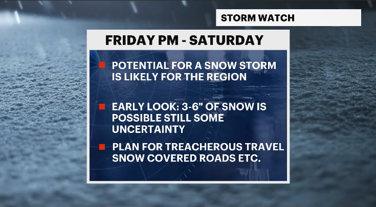 FRIDAY STORM WATCH: Cloudy during the day and much colder. Snow is likely to develop in the evening with periods of moderate and heavy bands through the night into Saturday. Highs in the low 30s. Lows in the 20s.