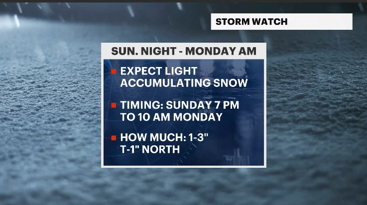 You can plan for the day to be dry until the evening, around 7PM or 8PM. Snow flurries to snow showers are expected to develop early at night, with accumulating snow beginning overnight through early Monday morning.