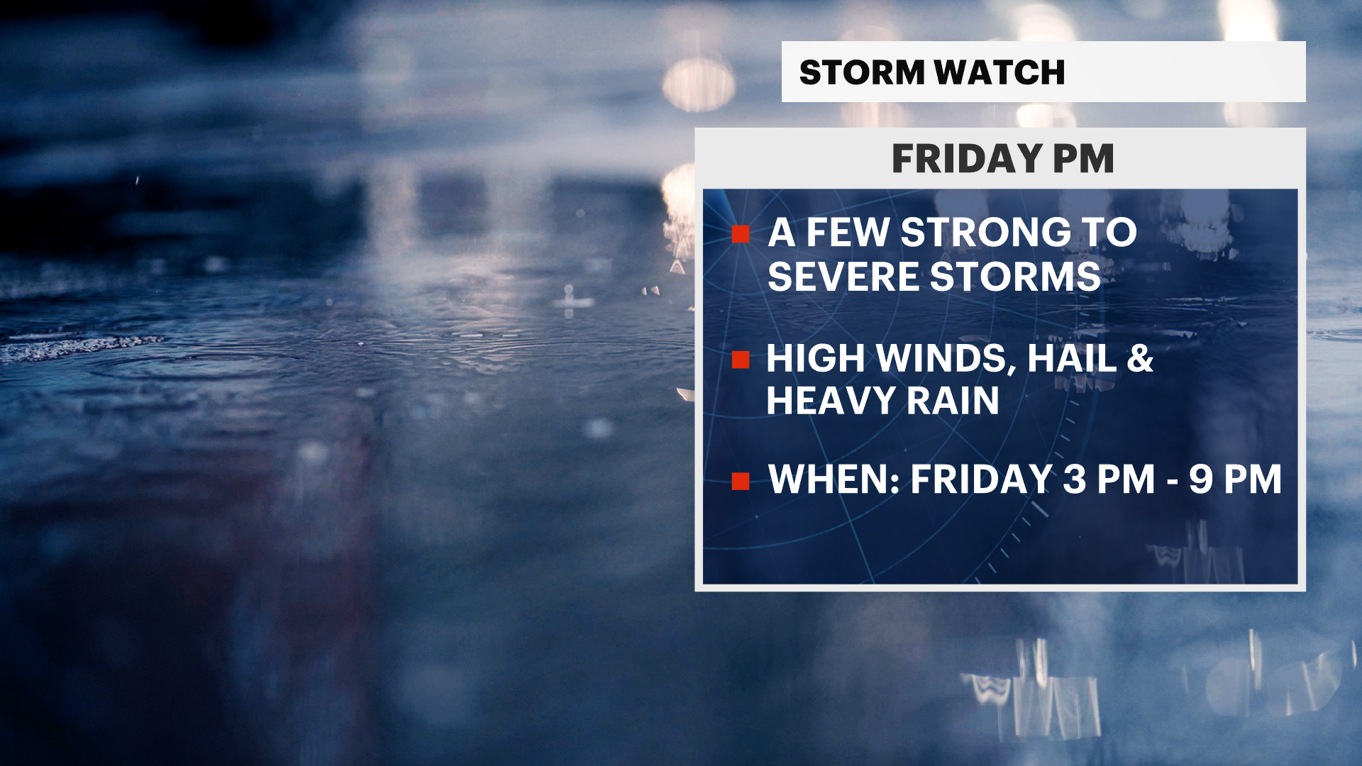 FRIDAY -- STORM WATCH: Partly sunny, very warm and humid with scattered showers and thunderstorms. High temperatures will be in the mid-80s. Low temperatures will be in the low-70s.
