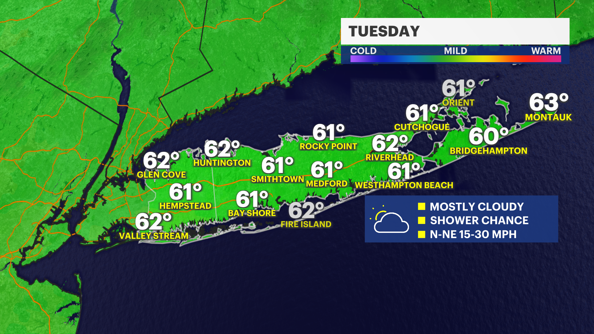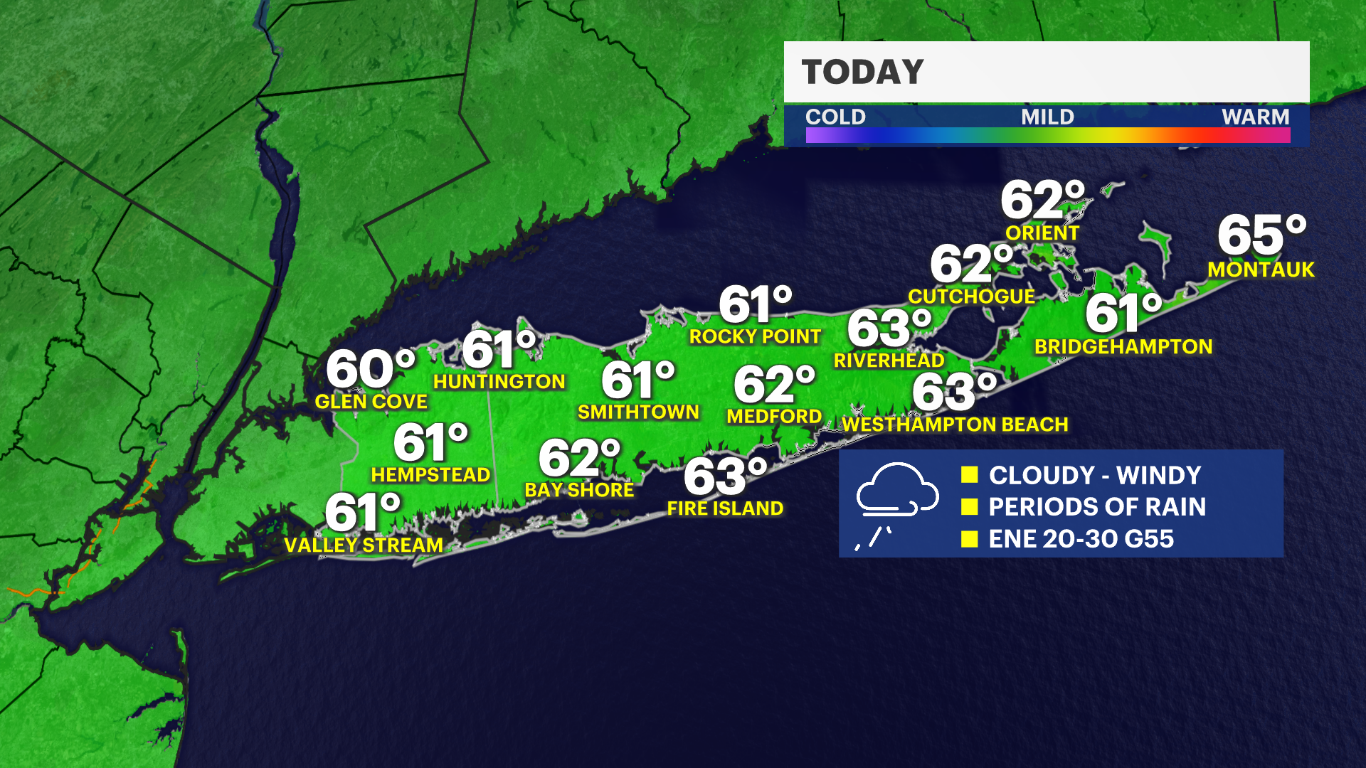 TODAY: Cloudy with periods of rain. High near 63. windy, with a northeast wind sustained 20-30 mph gusts 45 to 55 mph. Rain totals an additional 1 to 1.5 inches. Coastal flooding this afternoon. South shore between 1 p.m. and 5 p.m. North Shore 2 p.m. to 8 p.m.