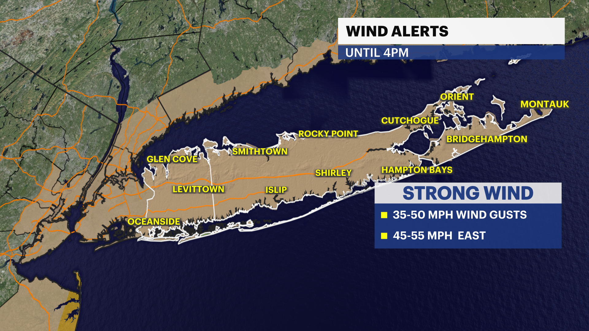 A wind advisory is in effect for western Long Island until 12 p.m., east of the William Floyd Parkway until 4 p.m. with gusts 45 to 55 mph.