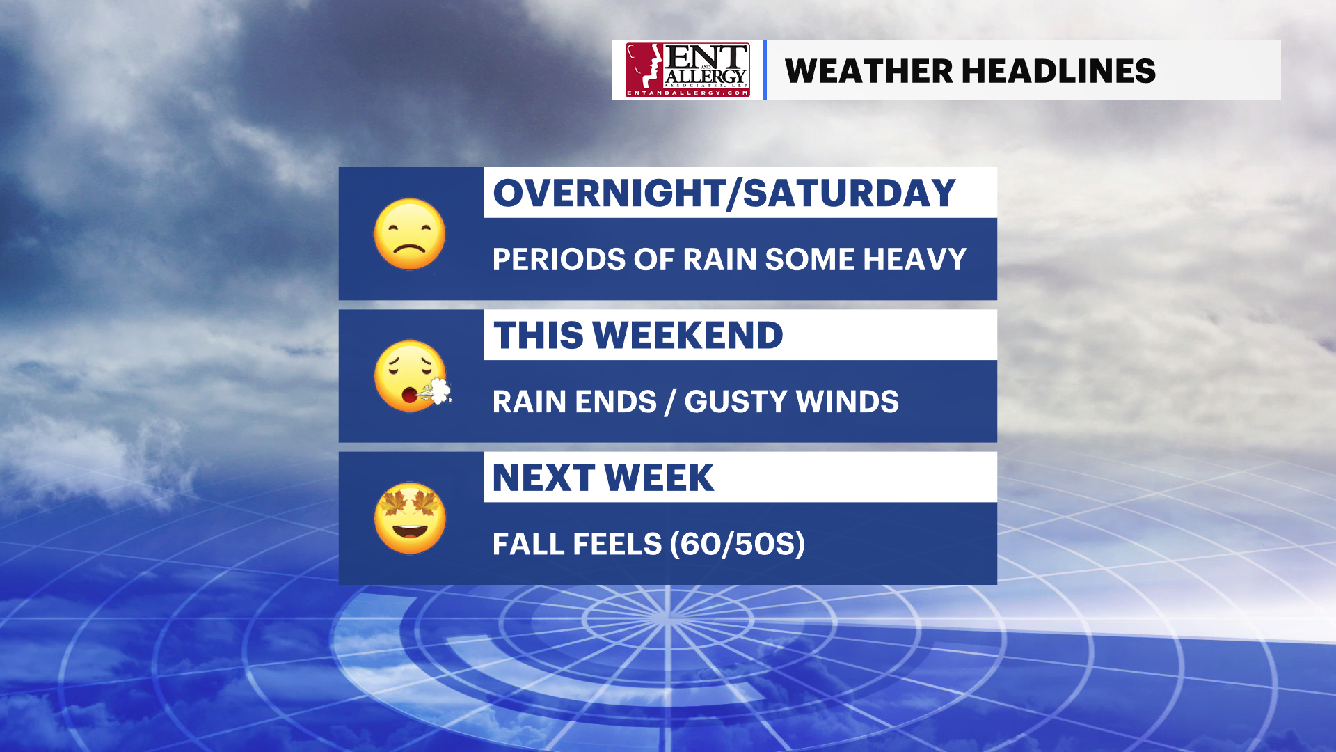 SATURDAY -- STORM WATCH: Bring the morning and afternoon plans indoors if possible. Periods of moderate to heavy rain are likely through the morning and into the start of the afternoon. Rain will begin to taper off mid-late afternoon. Scattered ponding cannot be ruled out. Breezy with winds between 10 to 20 mph. Highs near 68 degrees. Clearing during the evening and into the night with lows around 48 degrees.