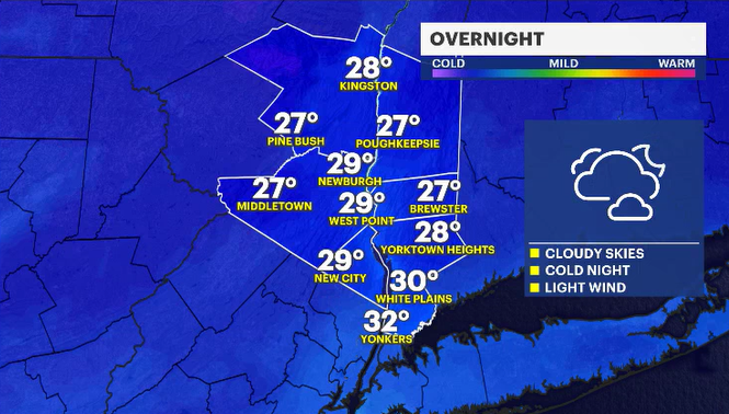 OVERNIGHT: Mostly cloudy, cold night. Lows near 30 degrees.