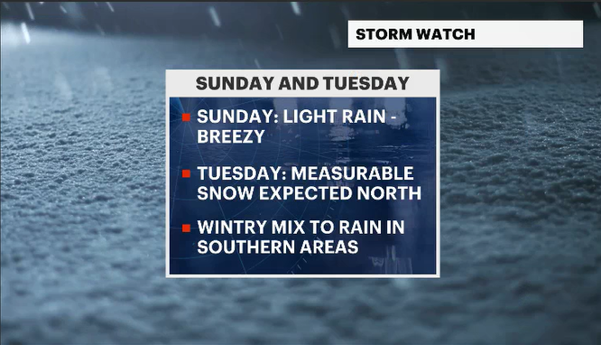 SUNDAY: Cloudy, winds will become breezy at times in the afternoon. Expecting light rainfall late in the morning and through the afternoon. The rain will end early at night. The skies will become clear with gusts near 20 mph.