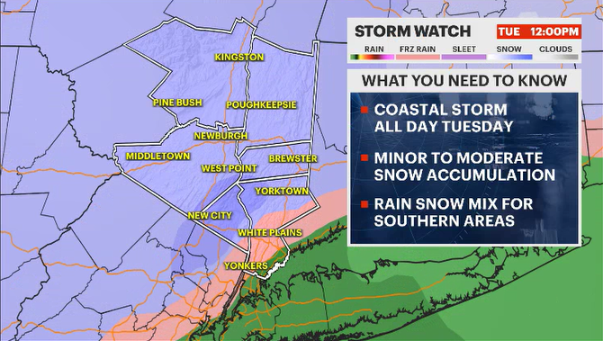 TUESDAY: Expecting light snow in the morning. In the afternoon, for southern counties, the snow will be transitioning to a wintry mix and rain. Areas to the north, light and moderate snowfall is likely and could see accumulating snow of 2-4" especially, in higher elevations. The storm will clear out by Tuesday night.