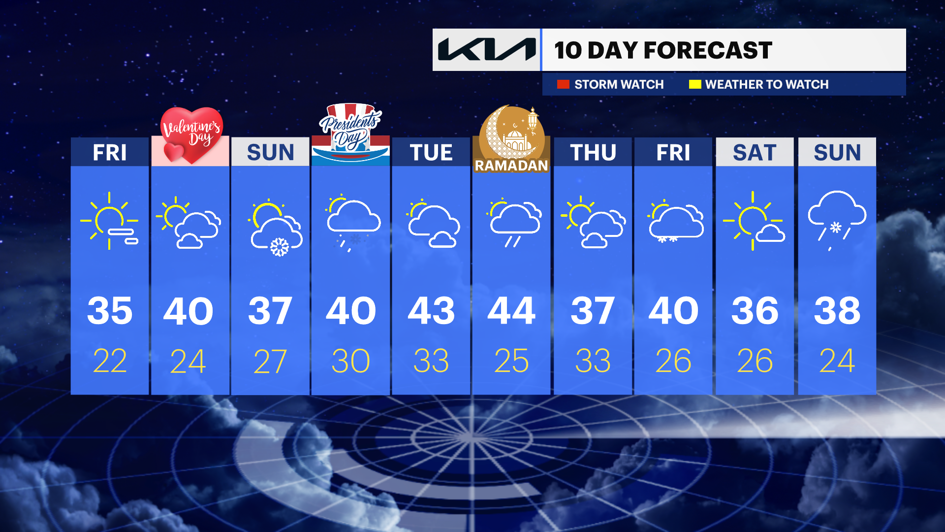 SATURDAY: VALENTINE'S DAY - Mix of sun & clouds with seasonal temperatures. Highs: Upper 30s to low 40s. Lows: Mid-20s.
