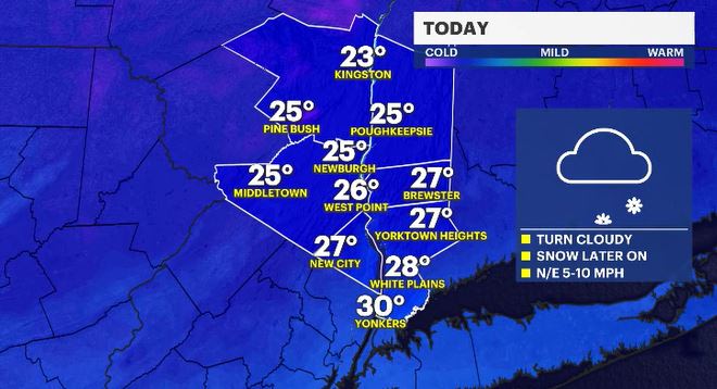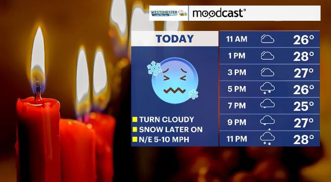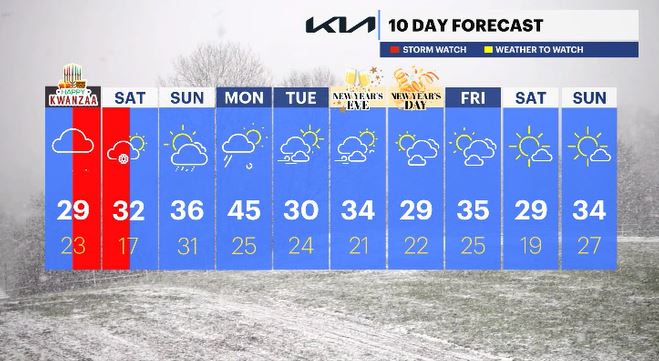 TODAY: STORM WATCH (PM) – Kwanzaa – Mostly cloudy with snow developing in the afternoon. Highs in the upper 20s to low 30s.