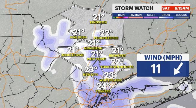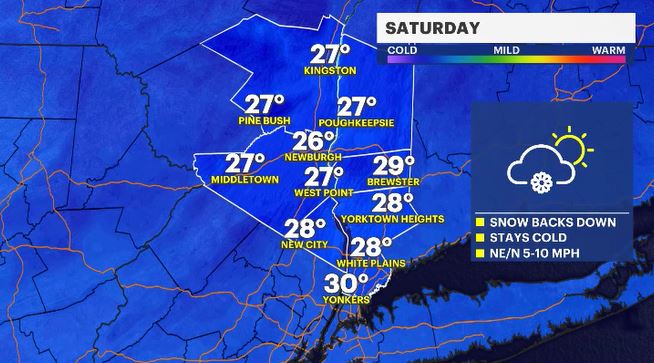 SATURDAY: STORM WATCH (AM) – Snow tapers early, then mostly cloudy. Highs in the low 30s. Lows in the upper teens.