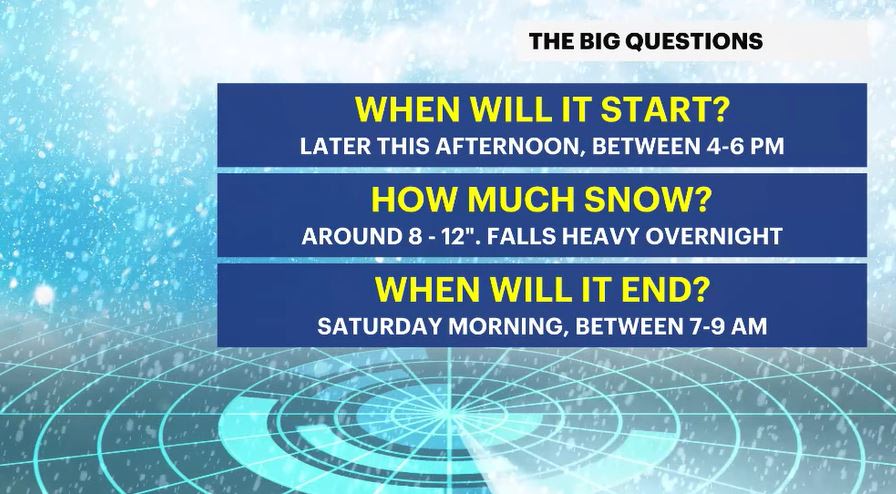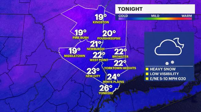 TONIGHT: STORM WATCH – Expect heavy snow at times with reduced visibility. Lows in the upper teens to mid-20s.