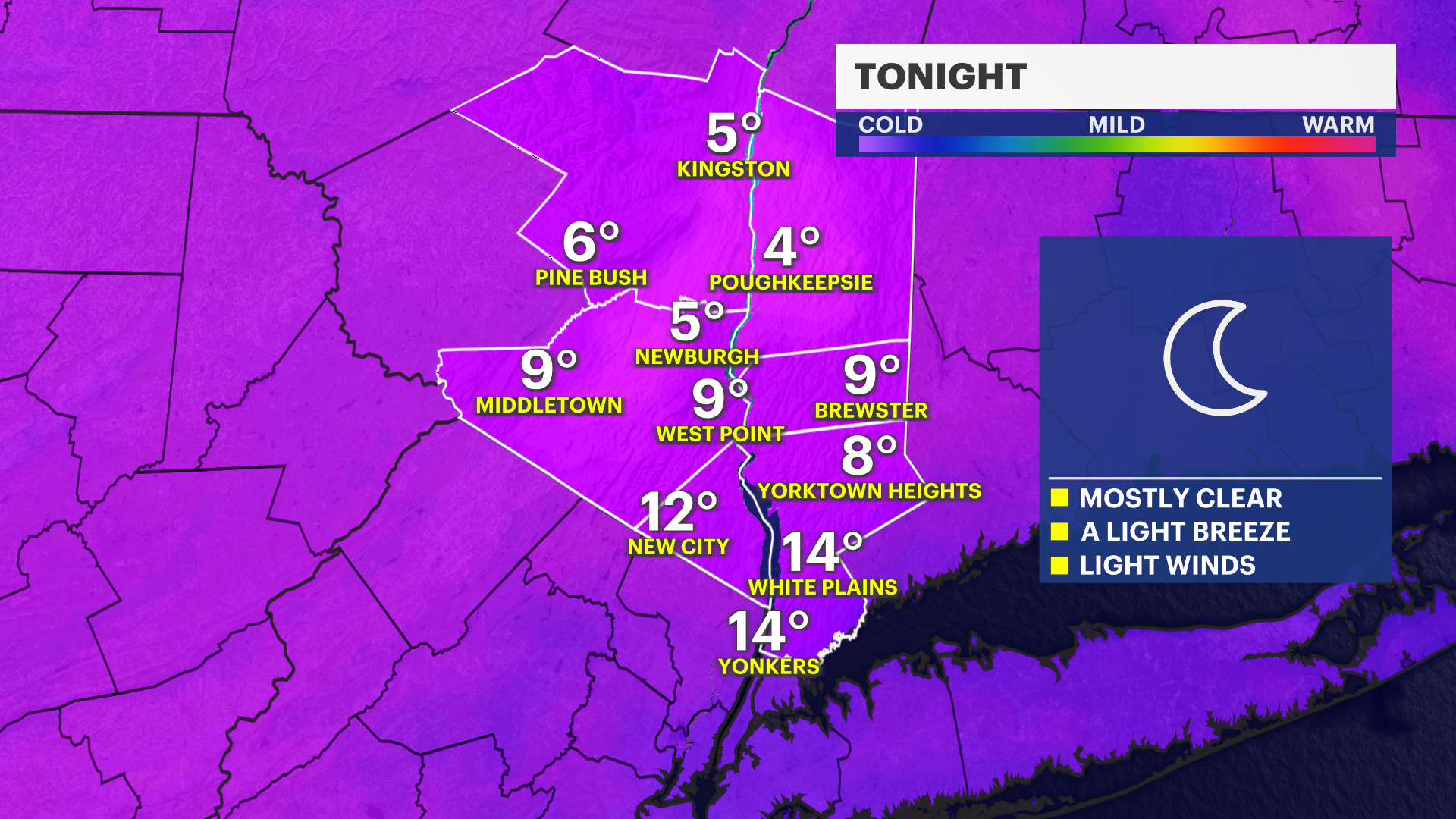 TONIGHT: Partly cloudy and cold with a light breeze. Lows: Mid-single digits to mid-teens.