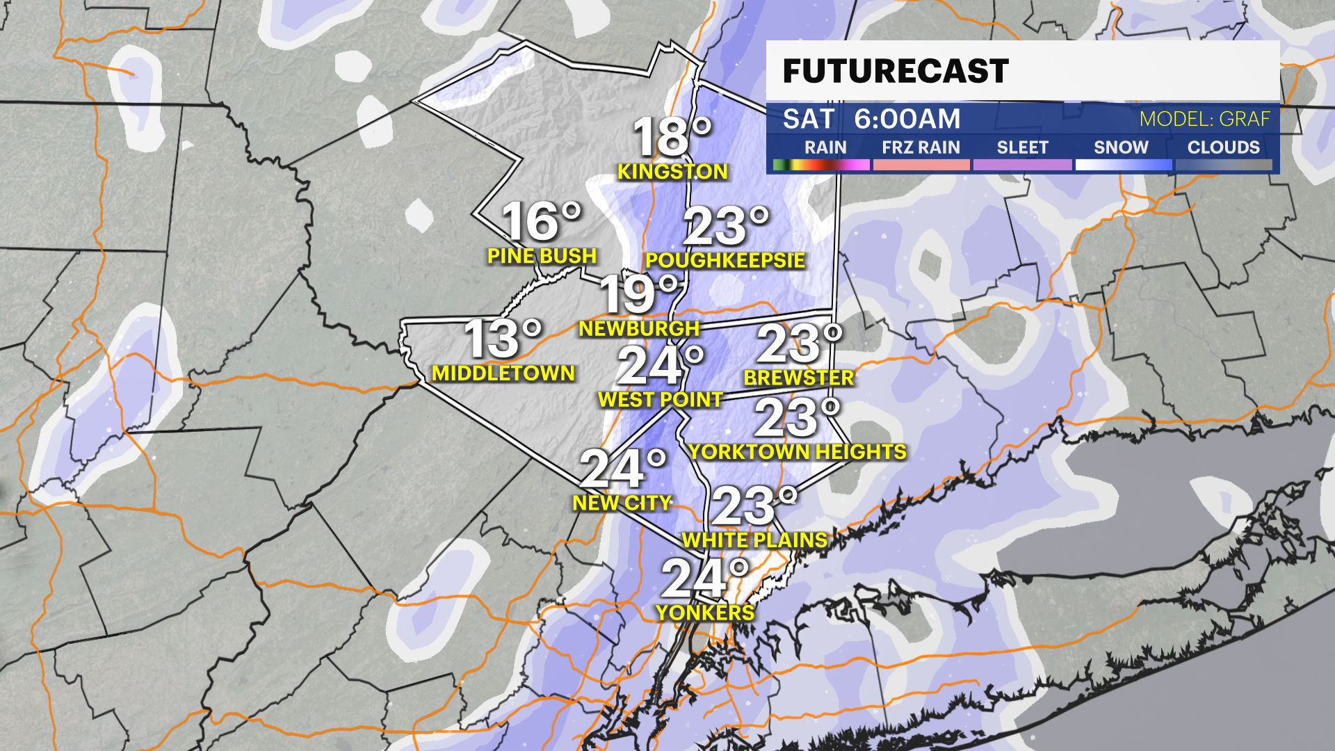 FRIDAY: Mostly cloudy with snow showers moving in for the afternoon to evening hours. Highs: Mid-20s. Lows: Mid-teens.
