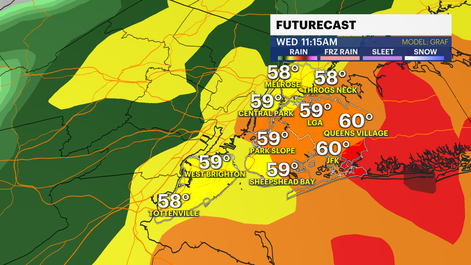 WEDNESDAY: Showers, heavy at times. Cooler. Highs in the 60s.