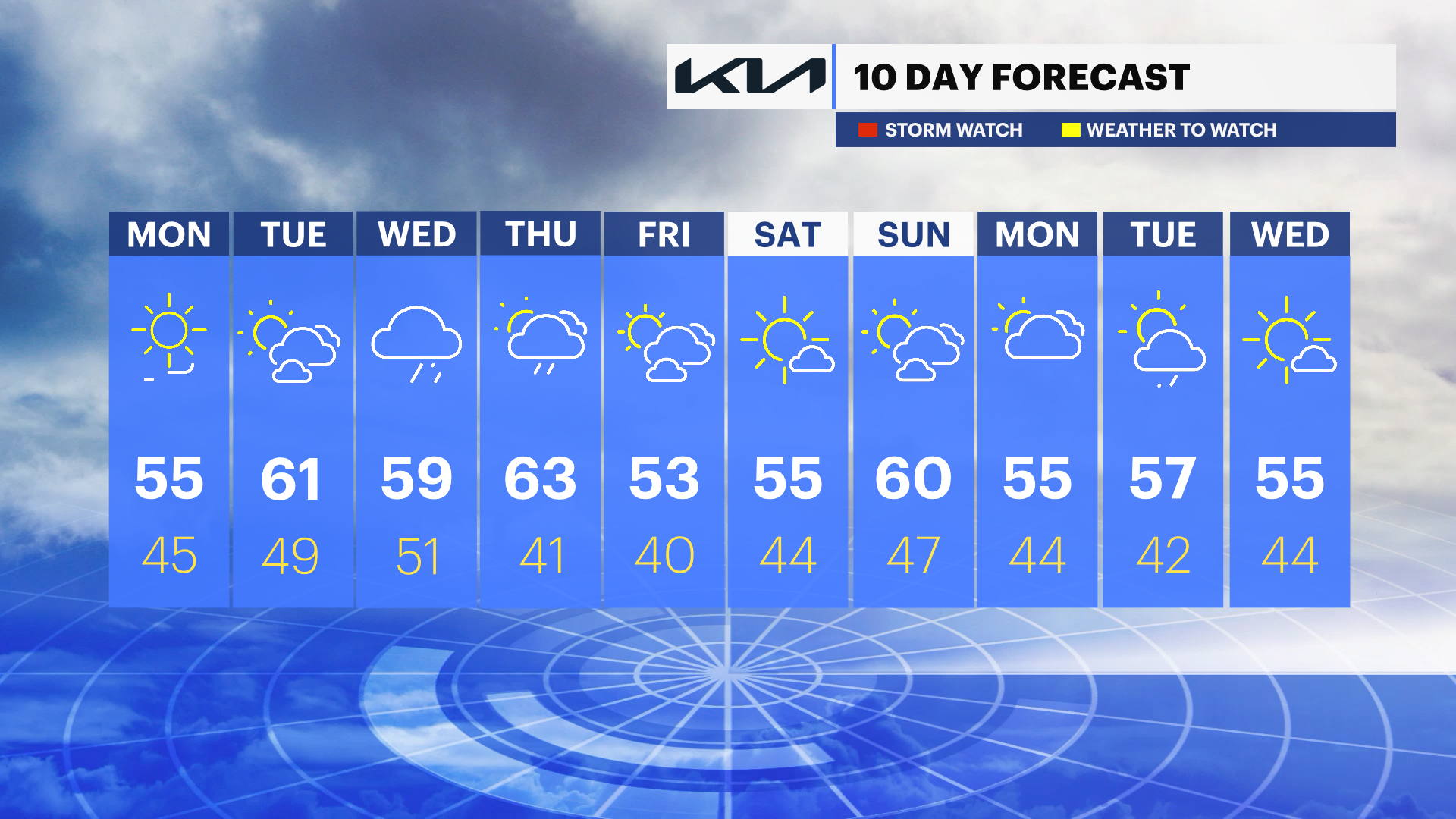 cloudy, rain returns late. Highs near 60, lows near 50.