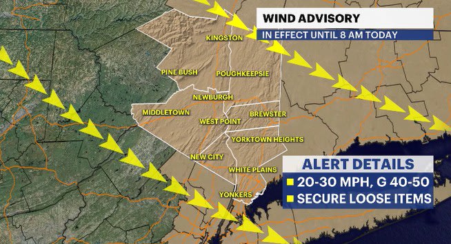The stormy weather from yesterday has moved away, but strong winds will hang around through the morning hours. Gusts could get as high as 50 mph until 8 a.m., and a wind advisory is in effect all across the Hudson Valley.