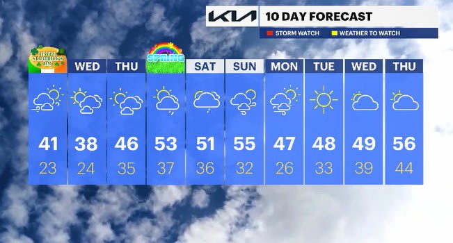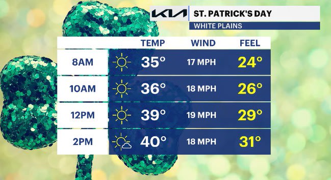 TUESDAY: WIND ALERT - ST. PATRICK'S DAY - Expect a mix of sun and clouds. Breezy to gusty winds linger for the morning hours with less winds over time. Highs: upper 30s to low 40s.