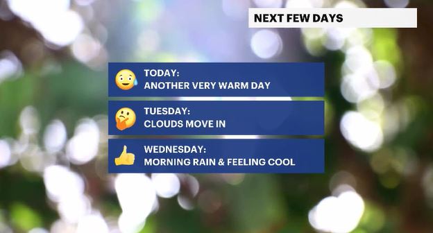 Temperatures will be in the 80s on Monday. The next chance for rain is late Tuesday night into Wednesday.