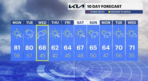 WEDNESDAY: Weather to Watch - Morning showers fade away to more sunshine and breezy winds. Highs: upper 60s. Lows: mid-40s.