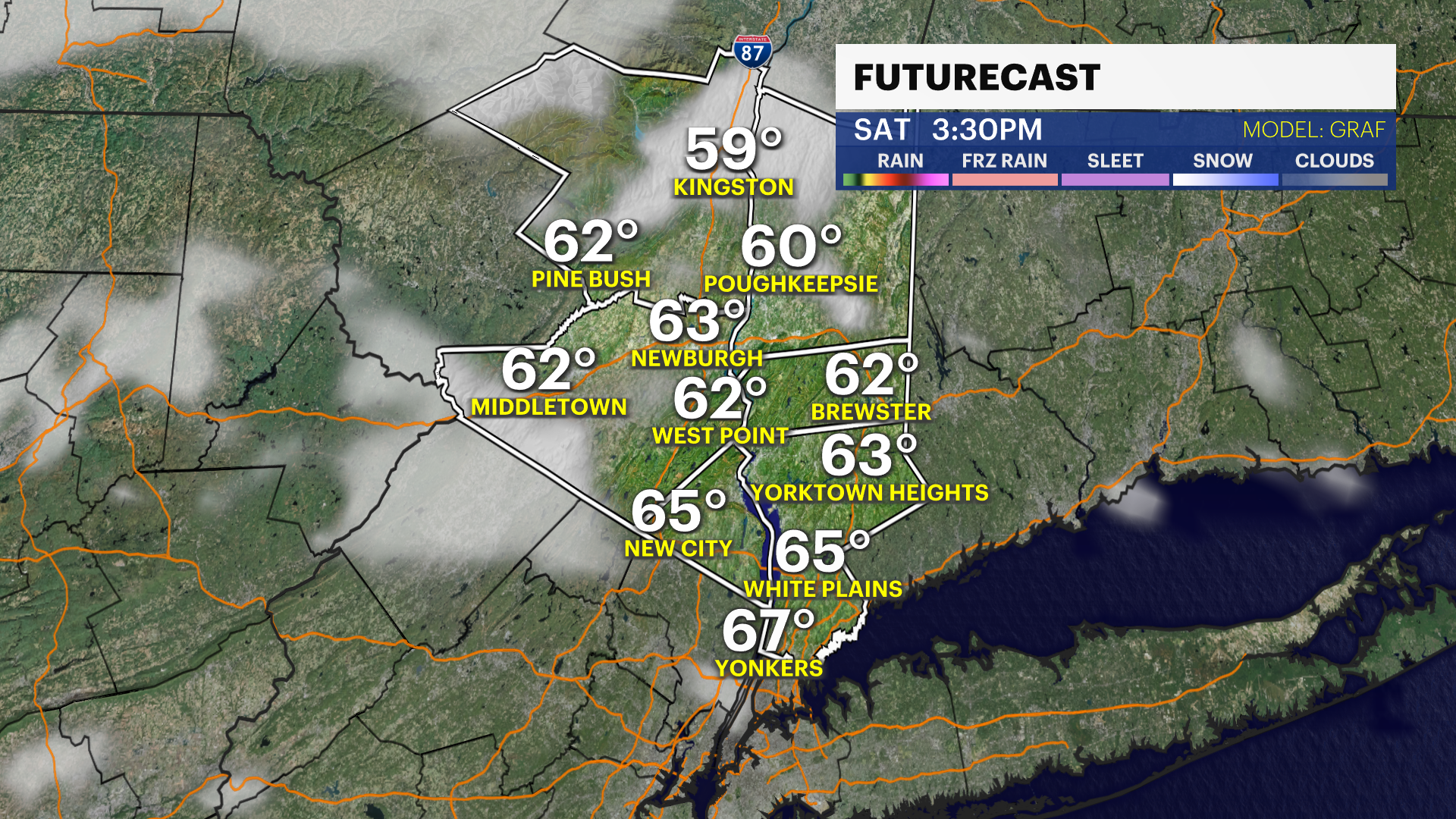 Saturday: Rain before sunrise, then more sun and very mild. Highs in the mid-60s.