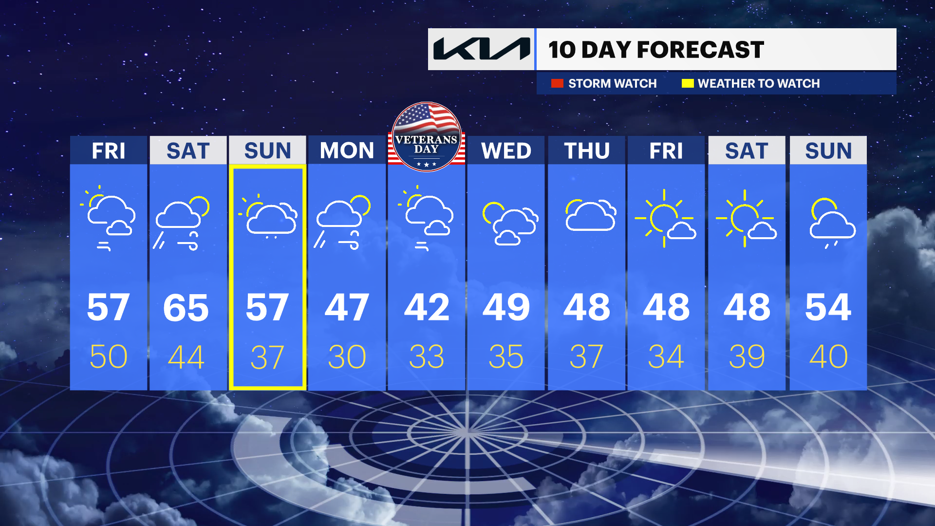 Veterans Day: A mix of sun and clouds and the coolest day in the forecast. Freezing temperatures in the morning and highs only in the low 40s.