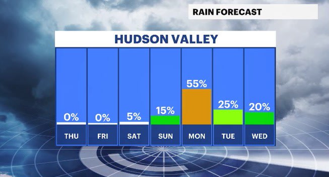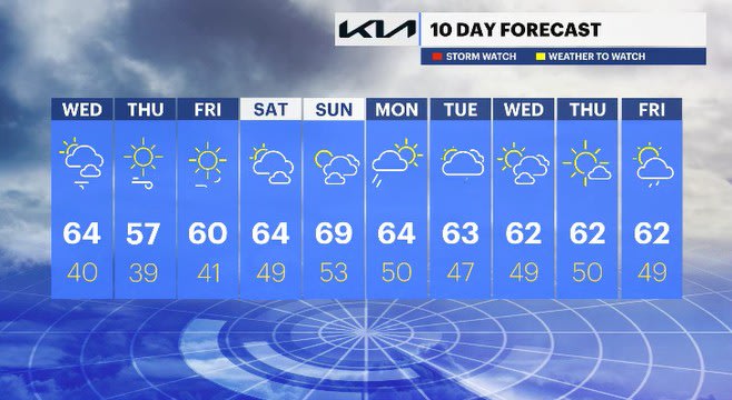 FRIDAY: Mostly sunny to mostly cloudy with a rain shower chance. Highs: upper 50s to low 60s. Lows: upper 40s.