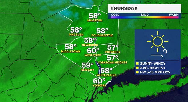 THURSDAY: Sunny skies, trending cold and windy at times. Highs: mid-to-upper 50s. Lows: upper 30s to low 40s.
