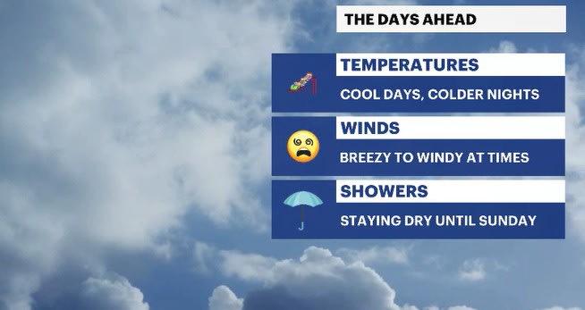 FRIDAY: Sunny skies, cool and crisp air, breezy winds at times. Highs: upper 50s to low 60s. Lows: upper 30s to low 40s.