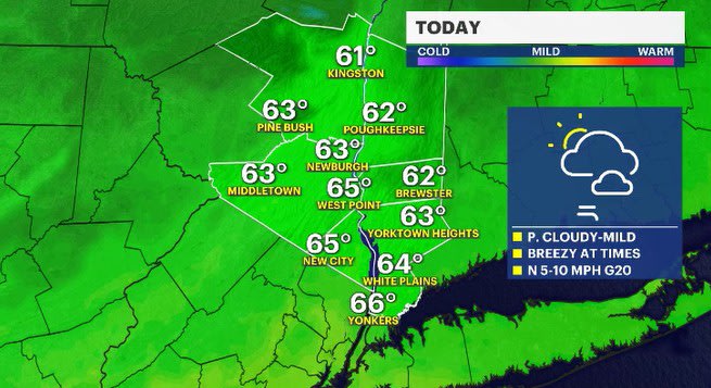 TODAY: Partly sunny and breezy at times. Highs: mid-60s.