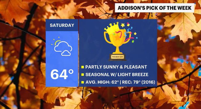 SATURDAY: Pick of the Week - Partly sunny and seasonal. Highs: mid-60s. Lows: upper 40s.