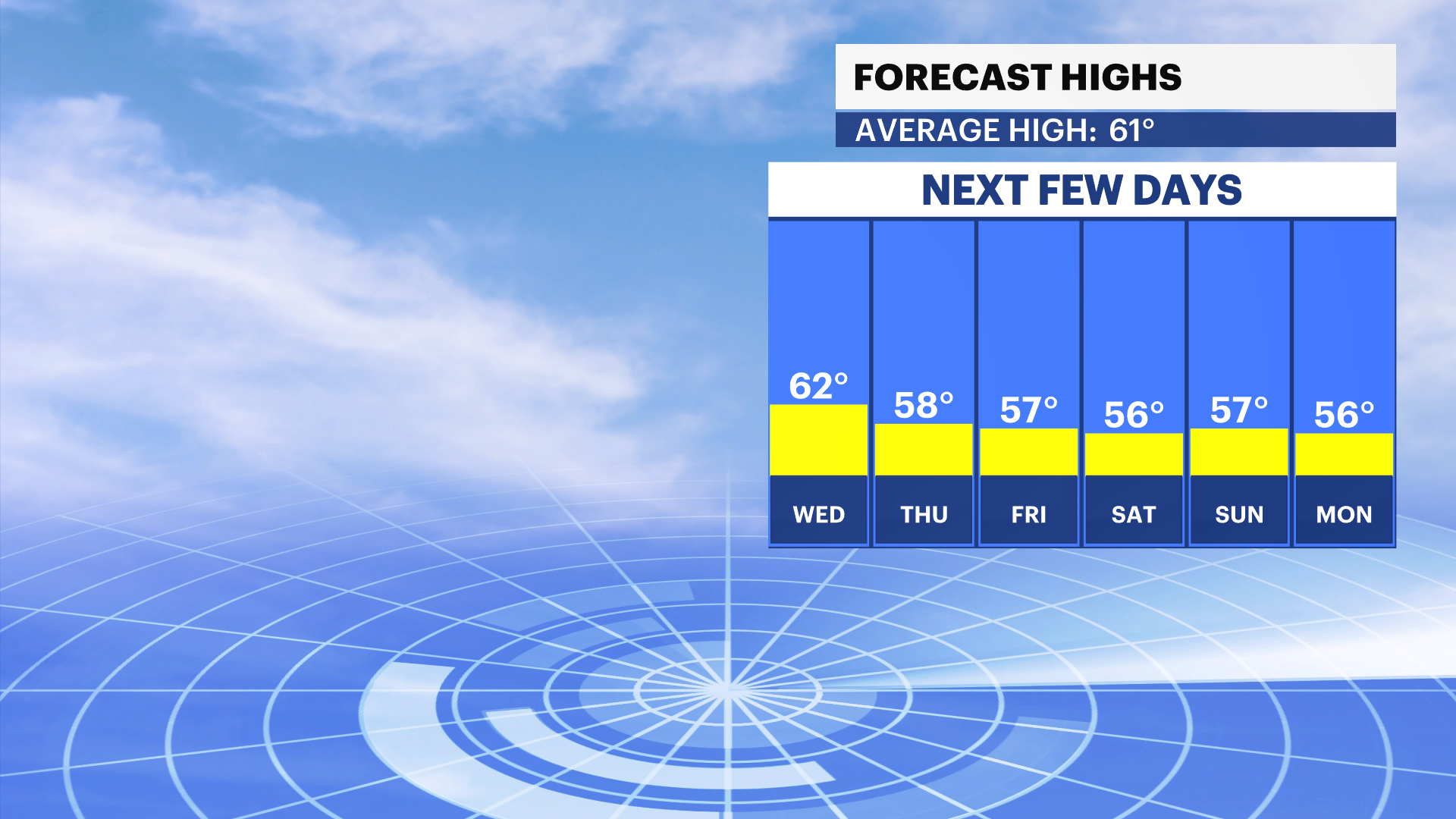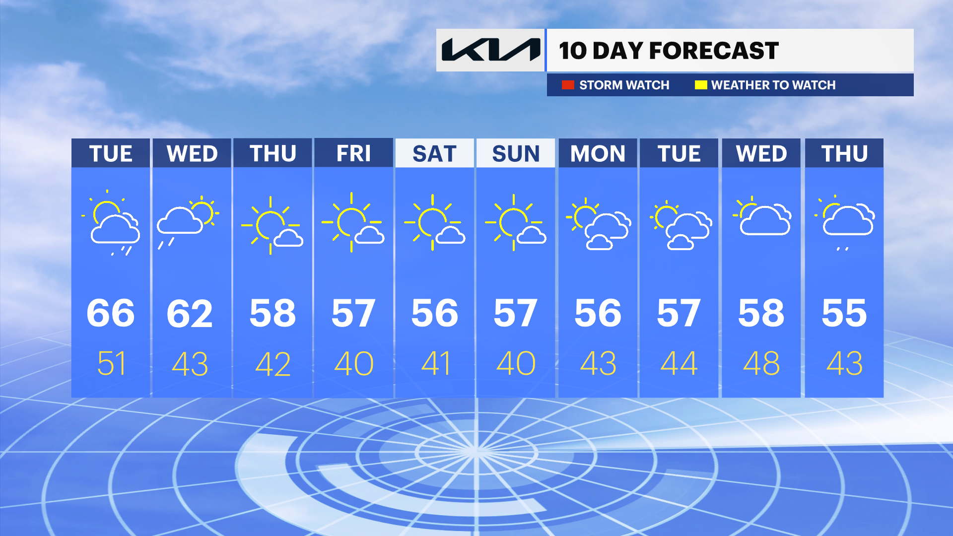 Thursday through Monday: A stretch of dry, seasonable fall weather. Expect mostly sunny days and cool nights, with highs in the upper 50s and lows near 40.