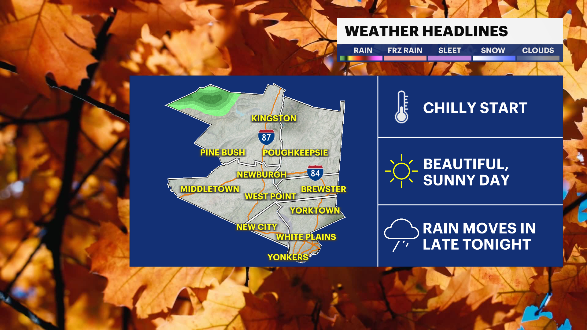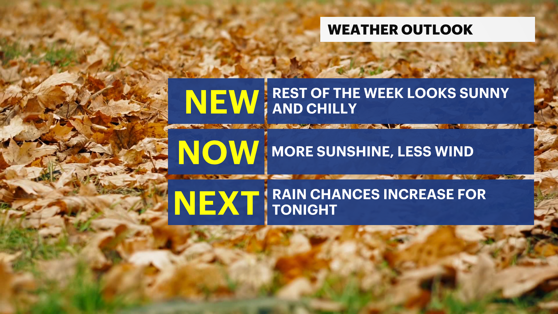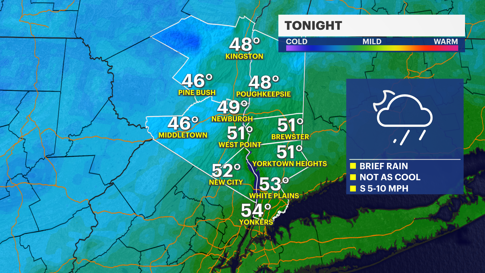 A bright, mild day gives way to late-night rain showers, followed by clearing skies and cooler air midweek.