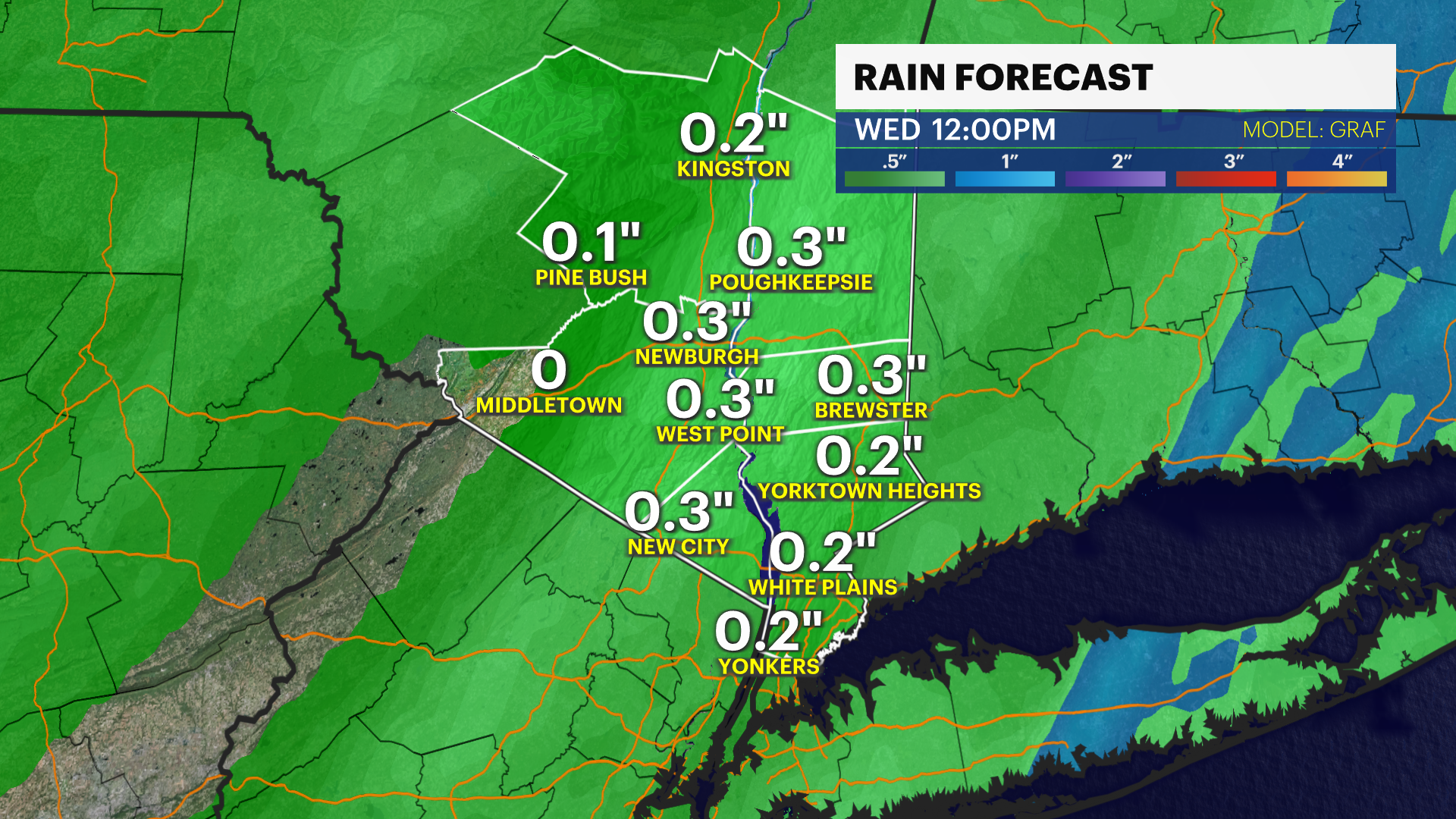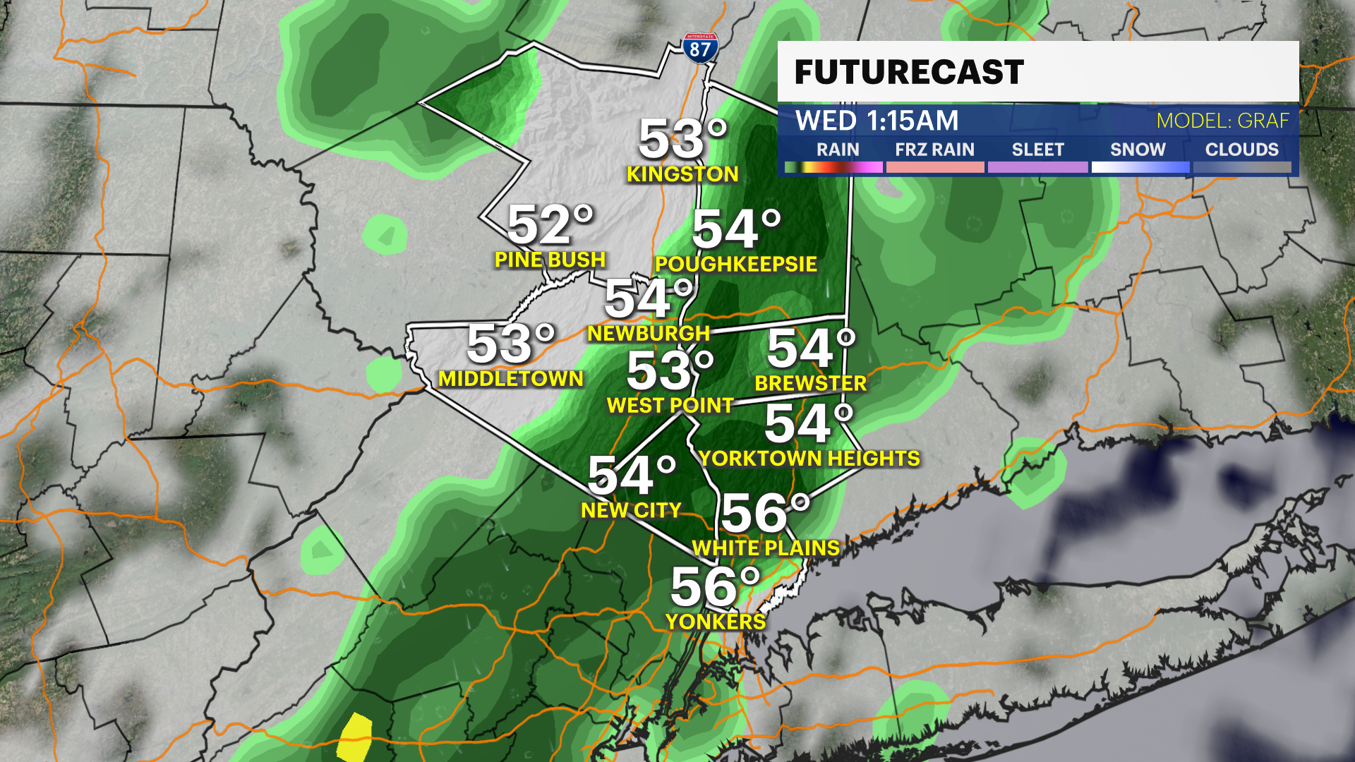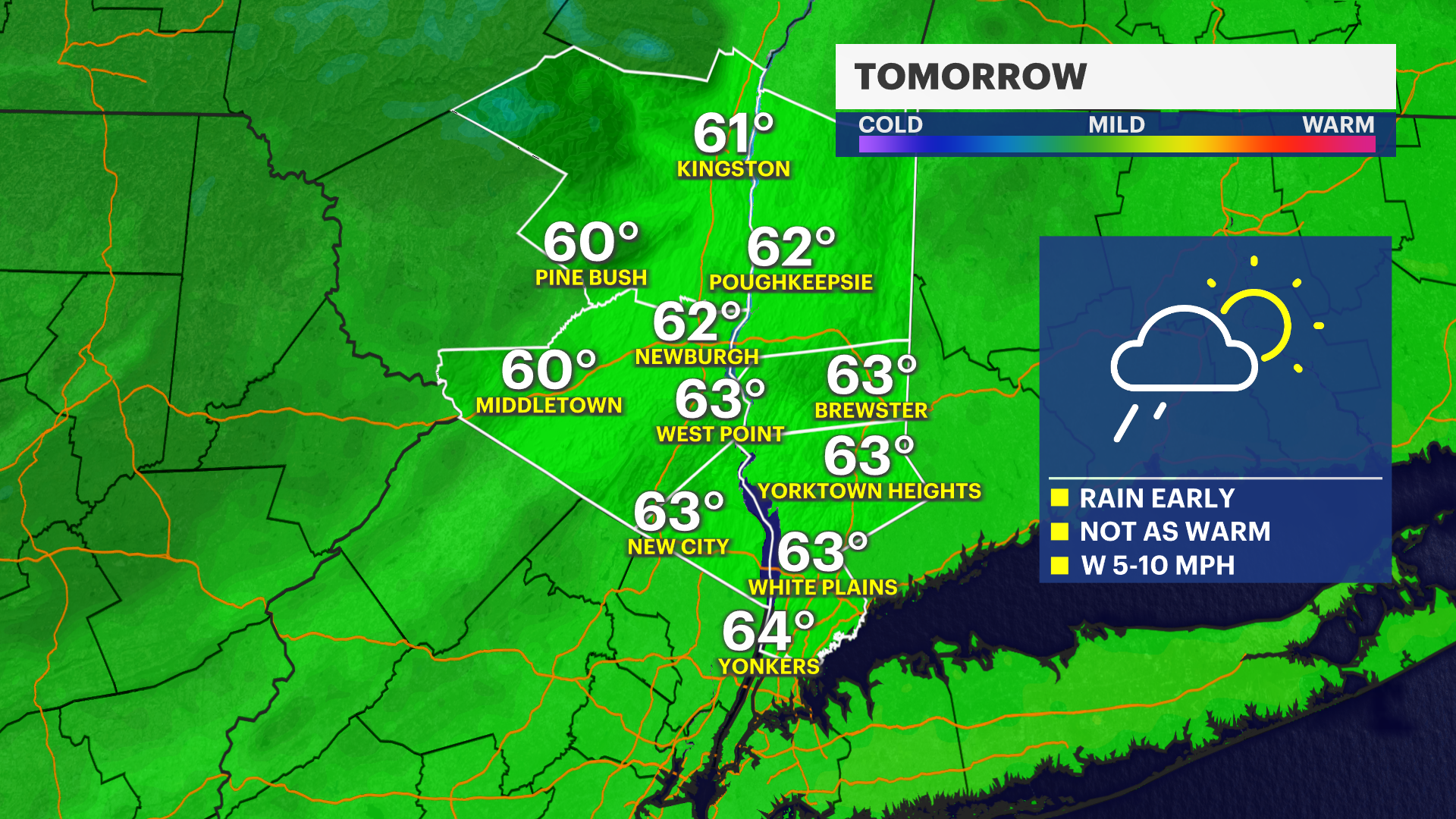 A bright, mild day gives way to late-night rain showers, followed by clearing skies and cooler air midweek.