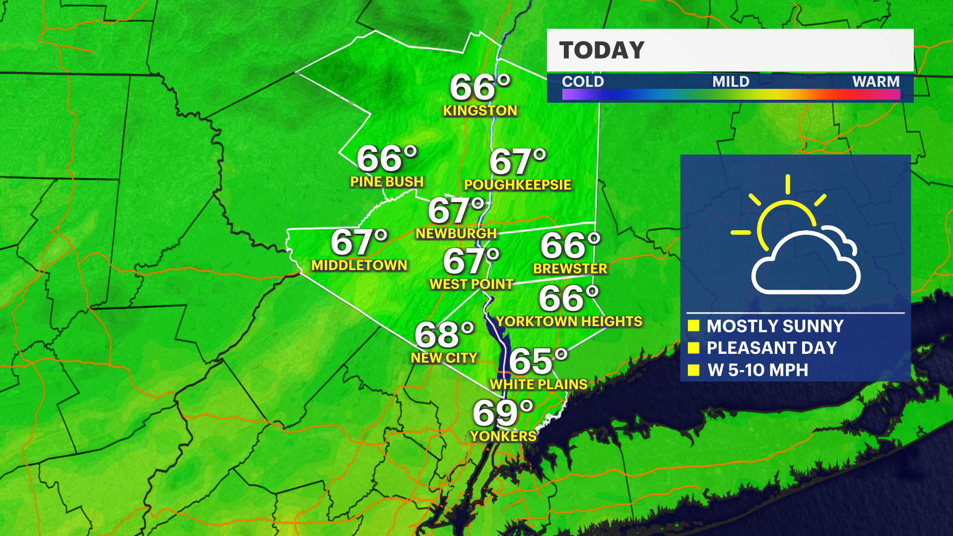Tuesday: Sunny and pleasant with highs in the mid to upper 60s. Light west wind around 10 mph.