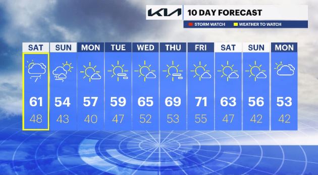 SATURDAY -- WEATHER TO WATCH (For the Morning): Scattered showers through the first half of the day. Breezy to windy conditions move in through the afternoon hours. Highs in the upper-50s to low-60. Lows in the mid-40s to low-50s.